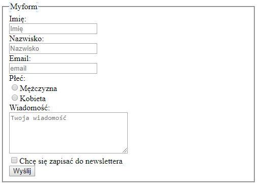 Fieldset tworzy nam obszar, który spaja ramką ze sobą wszystkie elementy formularza i grupuje je. Fieldset poisada też ciekawe atrybuty takie jak: disabled - który blokuje wszystkie elementy formularza, form dzięki któremu możemy dodać do formularza elementy, które są poza nim, oraz name - ten atrybut posiada większość elementów, zastępuje id, kiedy korzystamy np ze skryptów php.