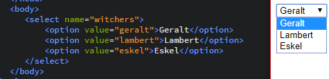 Atrybuty select i option wyświtlają nam listę wyboru. Na przykładzie wygląda to tak: