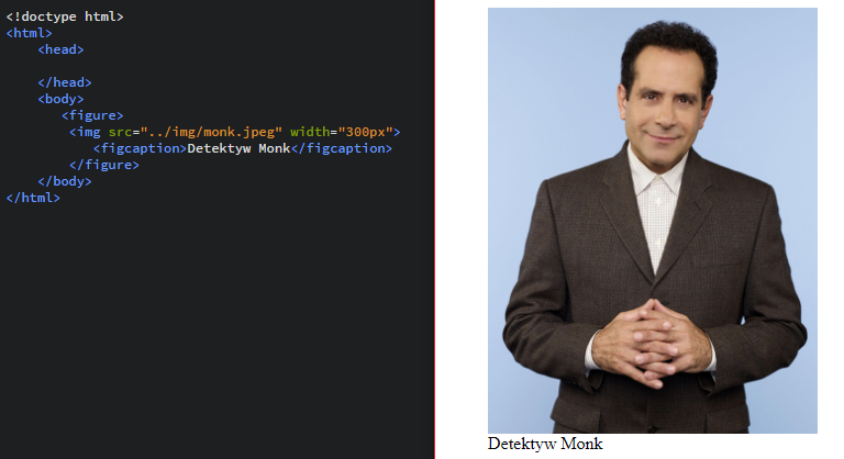 Wrzucając obrazek często chcemy, aby znalazł się pod nim podpis. Do tego najlepiej użyć znacznika figure wewnątrz którego umieszczami obraz img oraz znacznik figcaption wewnątrz którego wpisujemy podpis do obrazka