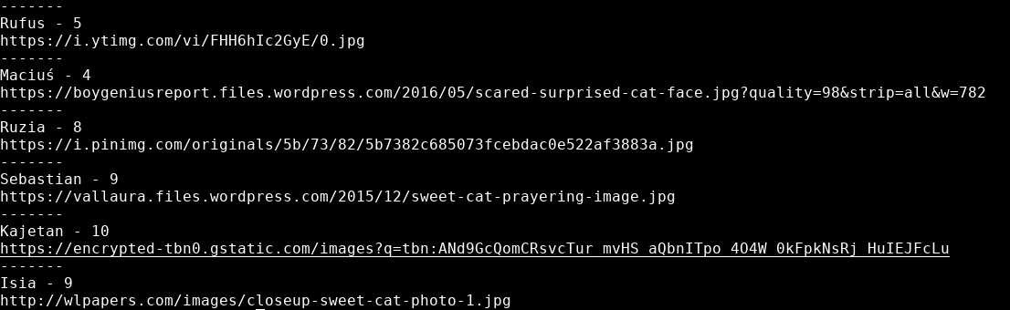 Skopiuj tablicę z pliku koty do swojego skryptu, następnie napisz funkcję która wypisze n pierwszych rekordów z owej tablicy (n bedzie parametrem funkcji), w formie <Imię kota> - <poziom słodkości> \n <link> (znaki " < " oraz ">" pomijamy). Jeśli przekazane do funkcji n będzie zbyt duże, należy wypisać odpowiedni komunikat.