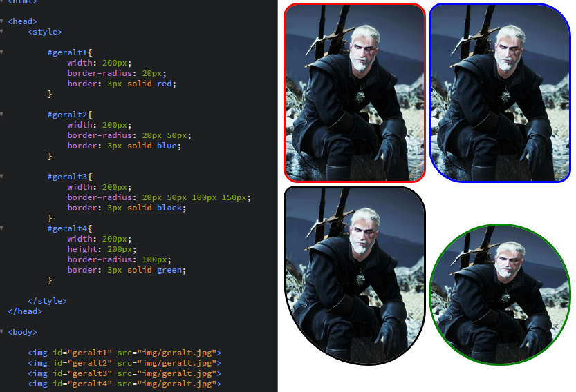 Jak widać na ostatnim przykładzie border-radius daje nam ciekawą funkcję - jeśli nasz obrazek jest kwadratem to nadając mu border radius o wartości przynajmniej połowie długości jego boku (lub procentowo nadamy min. 50%) wtedy obrazek będzie okrągły.