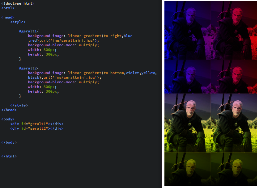 To już trochę hardkor, ale efekty tego są naprawdę ciekawe. Tam gdzie mamy własność background-image z naszym odnośnikiem dodajemy dodatkowo nasz gradient. To jednak nie wystarczy, ponieważ musimy jeszcze użyć dodatkowej własności background-blend-mode: która będzie naszym łącznikiem (dosł. "mieszaczem") między tymi warstwami. Nie będę wypisywał wszystkich wartości, moża je znaleźć tutaj, po prostu pokażę kilka efektów
