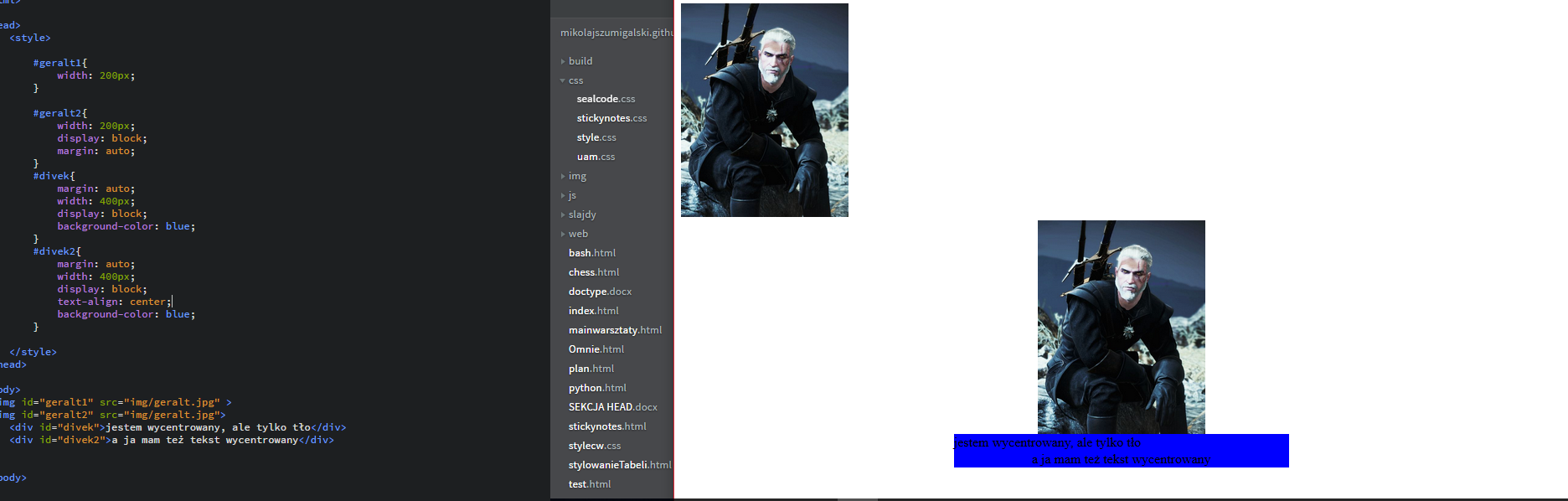 Żeby wycentrować obrazek nie trzeba używać znacznika center. Wystarczą do tego 2 własności użyte razem. Pierwsza to margin, która jak łatwo się domyślić służy do określenia marginesu elementu. Wartoś margin ustalamy na auto, wtedy przeglądarka sama nam obliczy odpowiedni margines. Do tego potrzebujemy display, czyli wybieramy sposób wyświetlania się elementu. Za pomocą niego ustalamy czy element wyświetla się liniowo (inline) czy blokowo (block). Obrazki domyślnie wyświetlają się liniowo, dlatego musimy ustawić display na block. Dlaczego? Element blokowy zawsze będzie wyświetlał się sam w jednej linii, więc jeśli przeglądarka musi sama określić automatycznie jej margines ustawi go jednocześnie z obu stron tak, że będzie on wyśrodkowany. Zasadniczo wystarczy wykuć na pamięć margin: auto; display: block, ale wolałbym, żebyście zrozumieni, skąd to się bierze, wtedy łatwiej z pamięci to napisać. Warta zapamiętania metoda, ponieważ można ją stosować też do innych elementów. Pamiętajmy jednak, że centrując np. diva, centrujemy tylko sam obiekt. Do wyśrodkowania np. tekstu w divie musimy już użyć własności text-align, którą ustawiamy na center