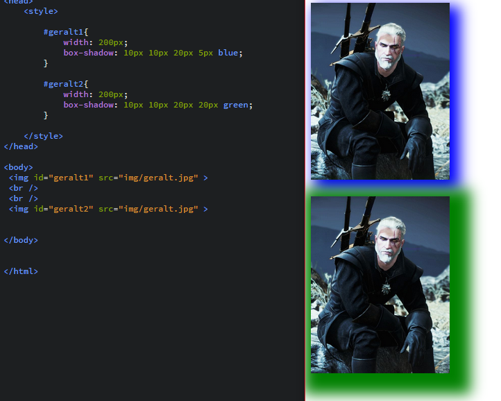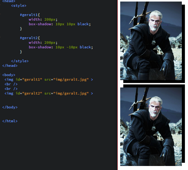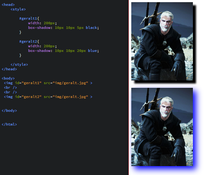 Czasami zwykły border może nam się wydawać mało estetyczny. W takim przypadku możemy użyć cieniowania i własności box shadow Posiada on sporo atrybutów. Cień traktujemy jak duplikację naszego obrazka, tylko zamieniamy treść obrazka na jakiś kolor i modyfikujemy jego wilkością i położeniem do uzyskania pożadanego efektu. Do modyfikowania położenia służą 2 pierwsze wartości. To odległości wierzchołka cienia od wierzchołka obrazka. Trzecia wartość to kolor cienia. Dla zrozumienia przykład.