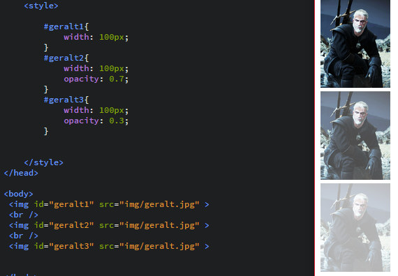 Ostatno mówiliśmy o przezroczystości kolorów, teraz powiemy sobie o przezroczystości obrazka, które wygląda bardzo podobnie. Wystarczy dodać właściwość opacity, która przyjmuje wartości liczbowe od 0 do 1. Im mniejsza wartość tym większa przezroczystość