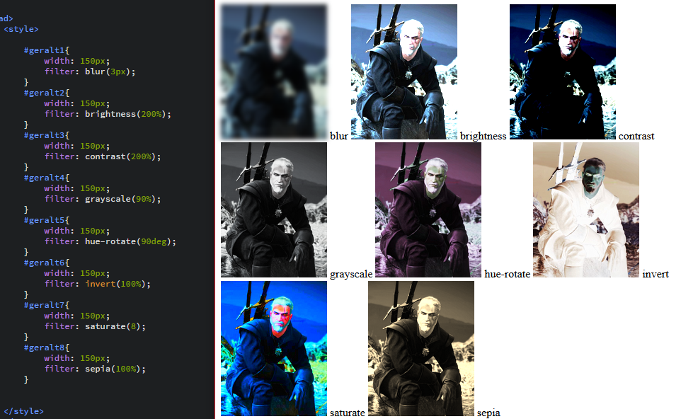 saturate(wartość-liczba) | saturacja(nasycenie), nie jestem grafikiem i nie chcę się wgłębiać w ten temat za mocno, chętnych odsyłam tutaj. Jest ona związana m.in. z wartościami RGB |