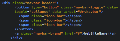 Tutaj będzie zdecydowanie najwięcej zabawy. Po raz kolejny odsyłam do lektury tego artykułu, ponieważ jest to bardziej skomplikowane od poprzednich rzeczy. Na początku naszej klasie nav nadajemy klasy navbar navbar-inverse. Pierwsza jest do tworzenia menu, druga, odwraca kolory tła i czcionki. Następnie wewnątrz dodajemy klasę container-fluid, ponieważ chcemy, aby menu było na całej szerokości strony, a nie z marginesami jak reszta. Potem tworzymy tzw. nagłowek menu. Będzie odpowiadał za przycisk odsyłający do strony głównej i tworzenia tzw. ikonki hamburger, która rozwija listę menu gdy ekran jest zbyt mały na pomieszczenie elementów menu. Wygląda to tak: